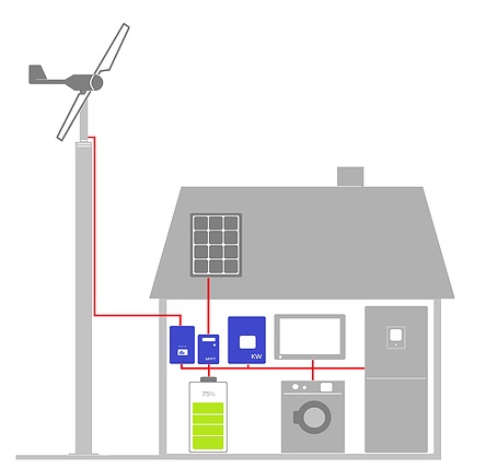 Los cargadores de baterias suelen ser de onda senoidal pura, encargado de recibir la corriente continua (DC) que generan los aerogeneradores y transformarla en corriente estable para la carga de las baterias.